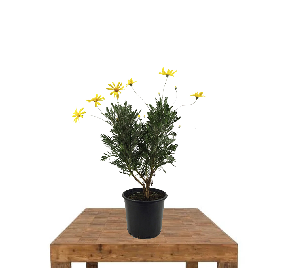 Euryops ( Sarı Papatya ), yıl boyunca açan sarı çiçeklere ve gri yapraklara sahiptir.